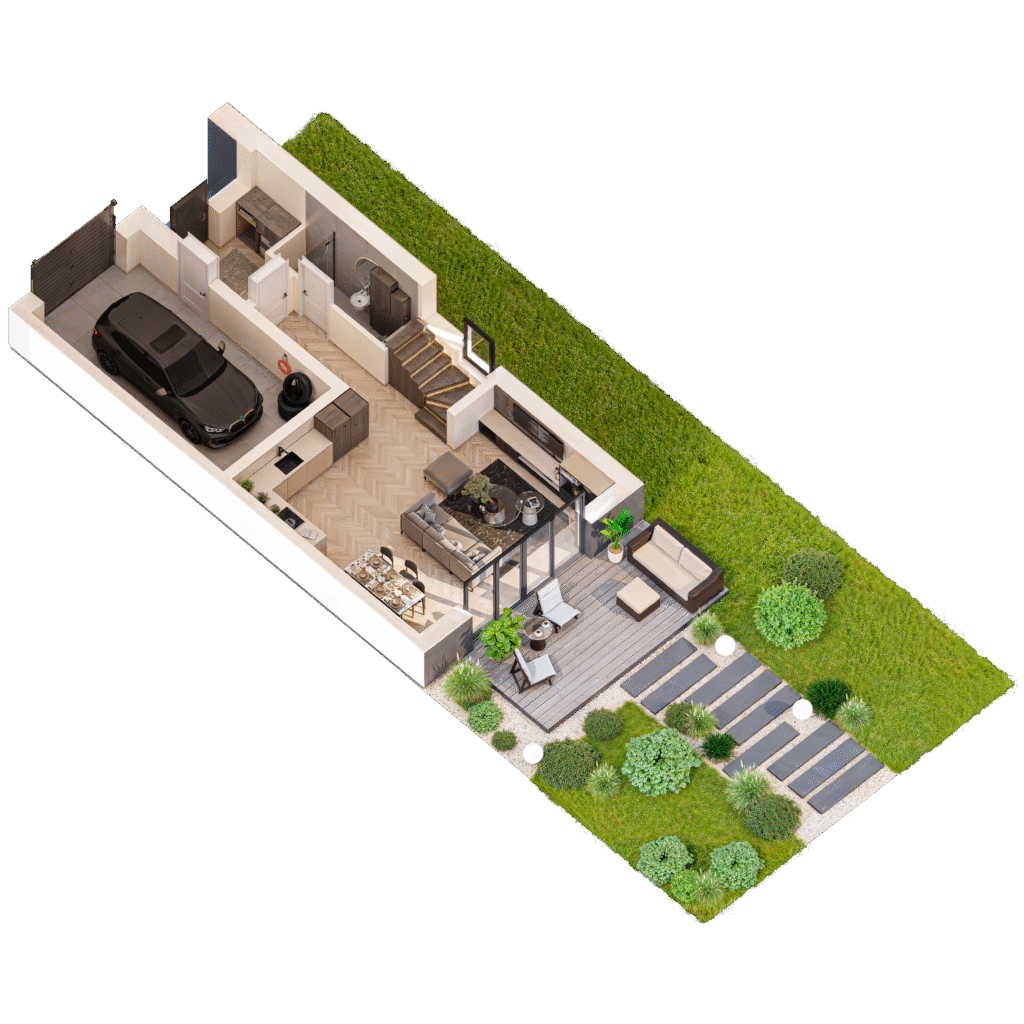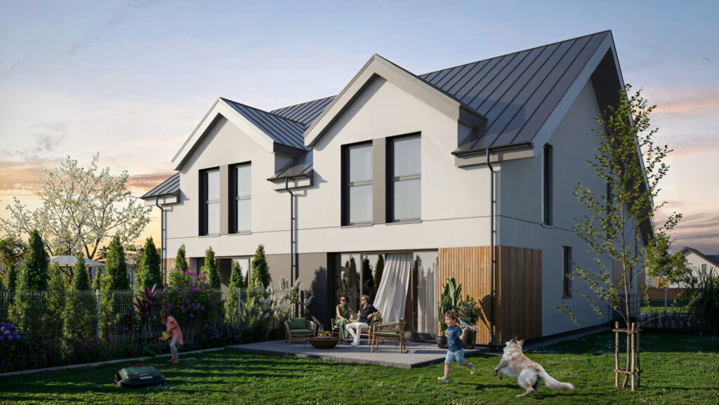 Inwestycja to 4 budynki dwulokalowe o powierzchni 128,89 m² na działkach od 521 do 573 m². Przestronny, komfortowy układ pomieszczeń, garaż w bryle budynku, prywatny ogródek.